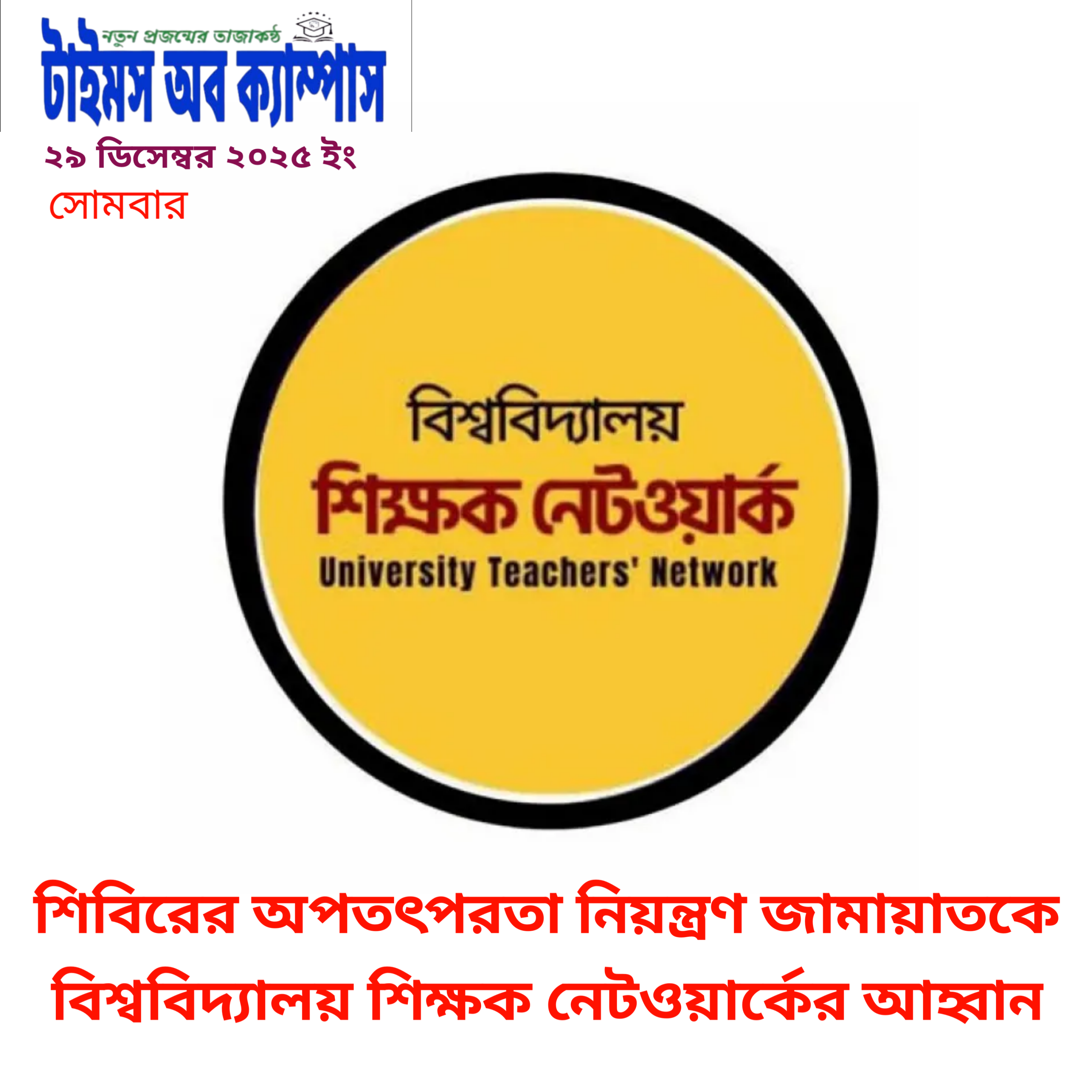 ✪টাইমস অব ক্যাম্পাস ডেস্ক রিপোর্ট :বাংলাদেশ জামায়াতে ইসলামীকে তাদের ‘অঙ্গসংগঠন’ ইসলামী ছাত্রশিবিরের ‘অপতৎপরতা’ নিয়ন্ত্রণের আহ্বান জানিয়েছে বিশ্ববিদ্যালয় শিক্ষক নেটওয়ার্ক। রোববার