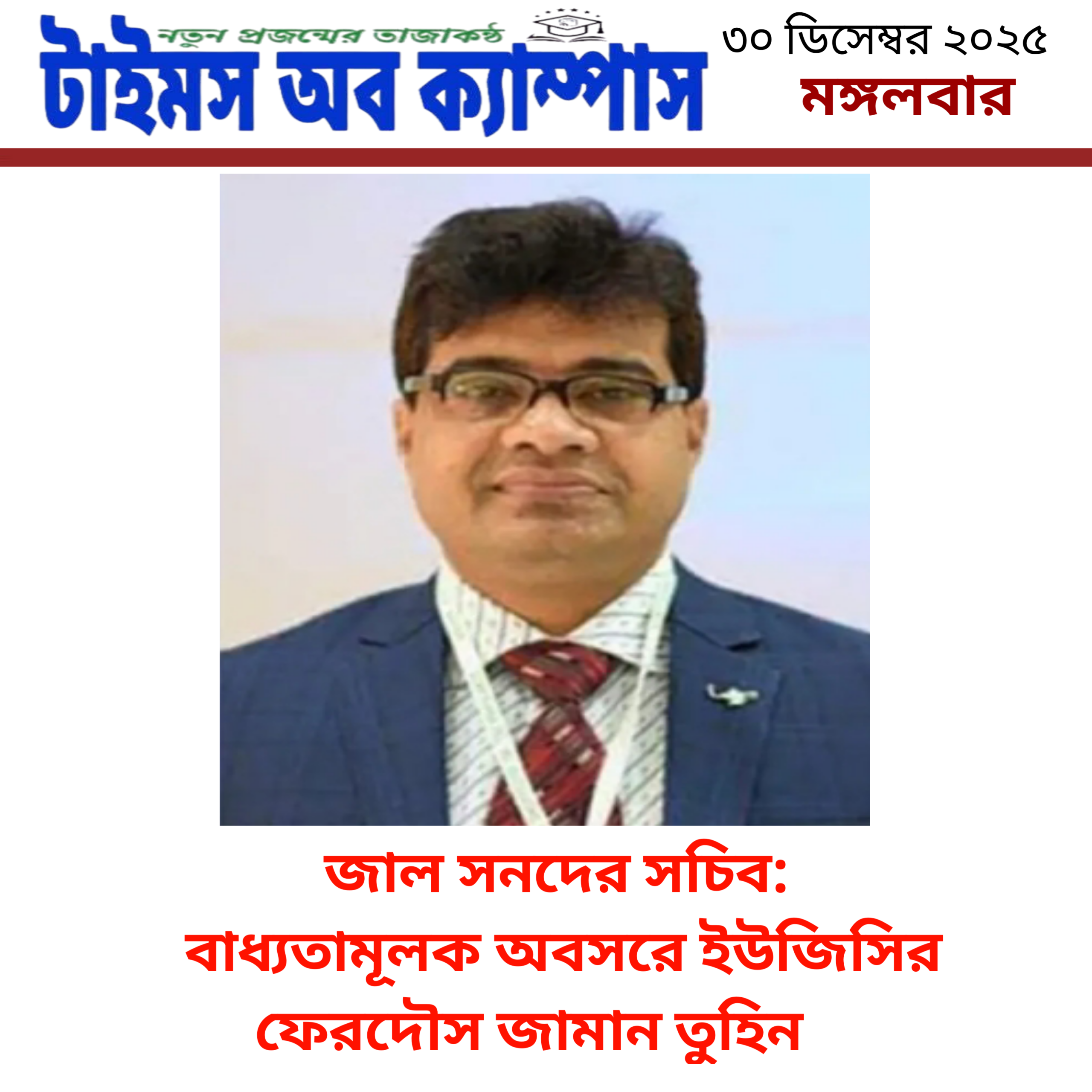 জাল সনদের সচিব: বাধ্যতামূলক অবসরে ইউজিসির ফেরদৌস জামান তুহিন ✪ টাইমস অব ক্যাম্পাস ডেস্ক রিপোর্ট :ইউজিসি দেশের সব বিশ্ববিদ্যালয়ের সর্বোচ্চ