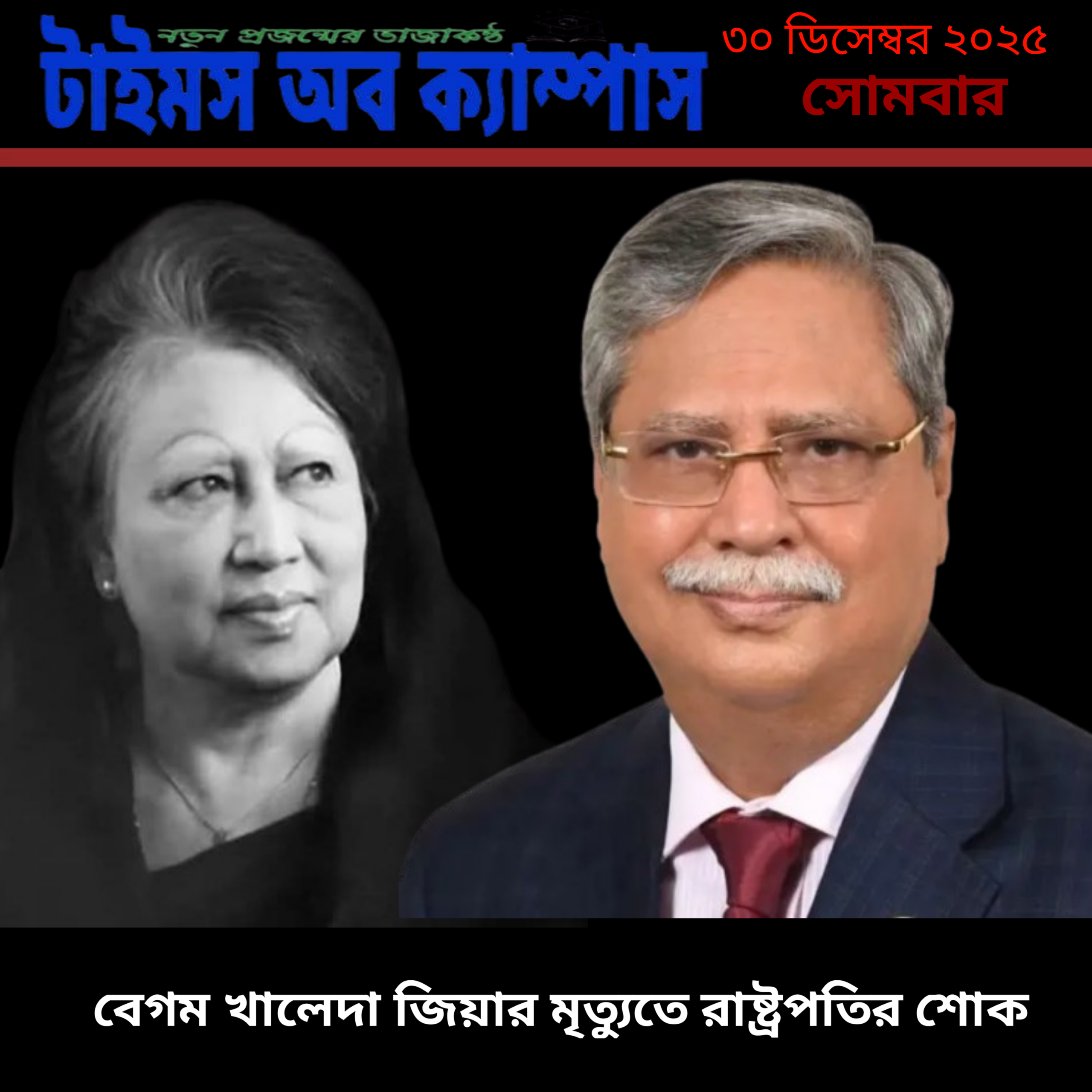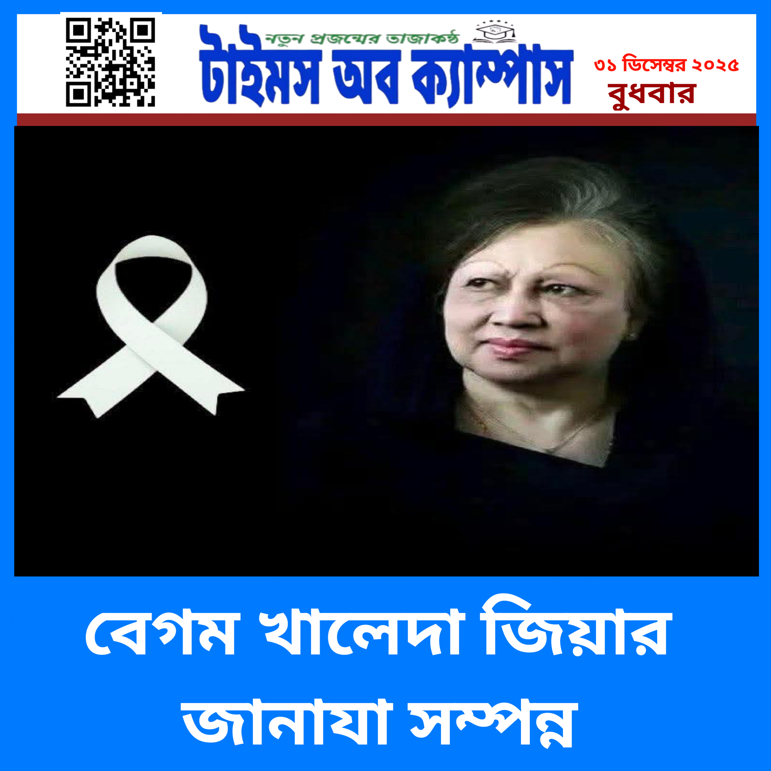✪ টাইমস অব ক্যাম্পাস ডেস্ক রিপোর্ট :তিনবারের প্রধানমন্ত্রী, গণতান্ত্রিক আন্দোলনের প্রতীক এবং বিএনপির চেয়ারপারসন খালেদা জিয়ার মৃত্যুতে গভীর শোক প্রকাশ