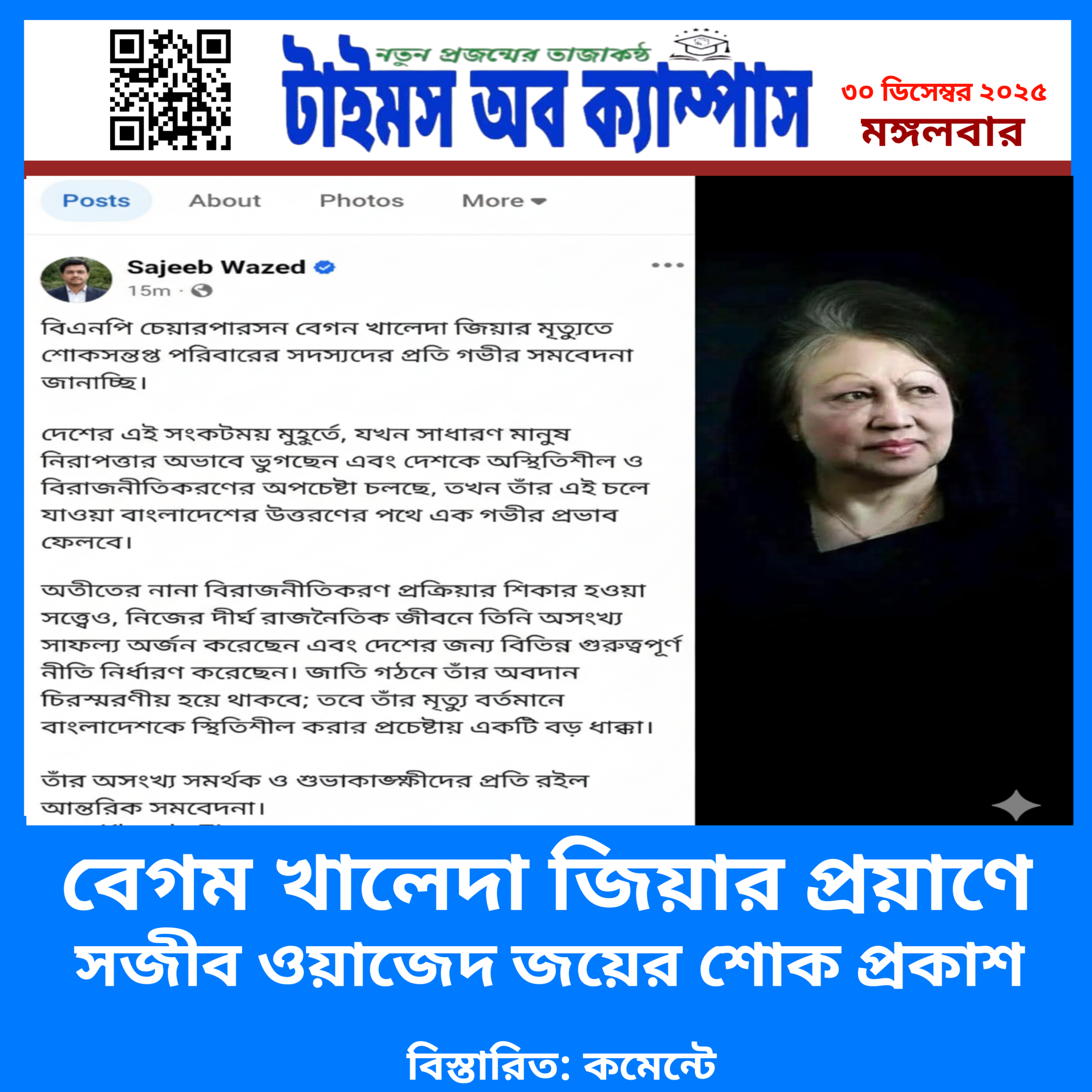 ✪ডেস্ক রিপোর্ট:বিএনপির চেয়ারপারসন ও সাবেক প্রধানমন্ত্রী বেগম খালেদা জিয়ার মৃত্যুতে সজীব ওয়াজেদ জয় শোকপ্রকাশ করে তার ভেরিফাই করা সামাজিক যোগাযোগ