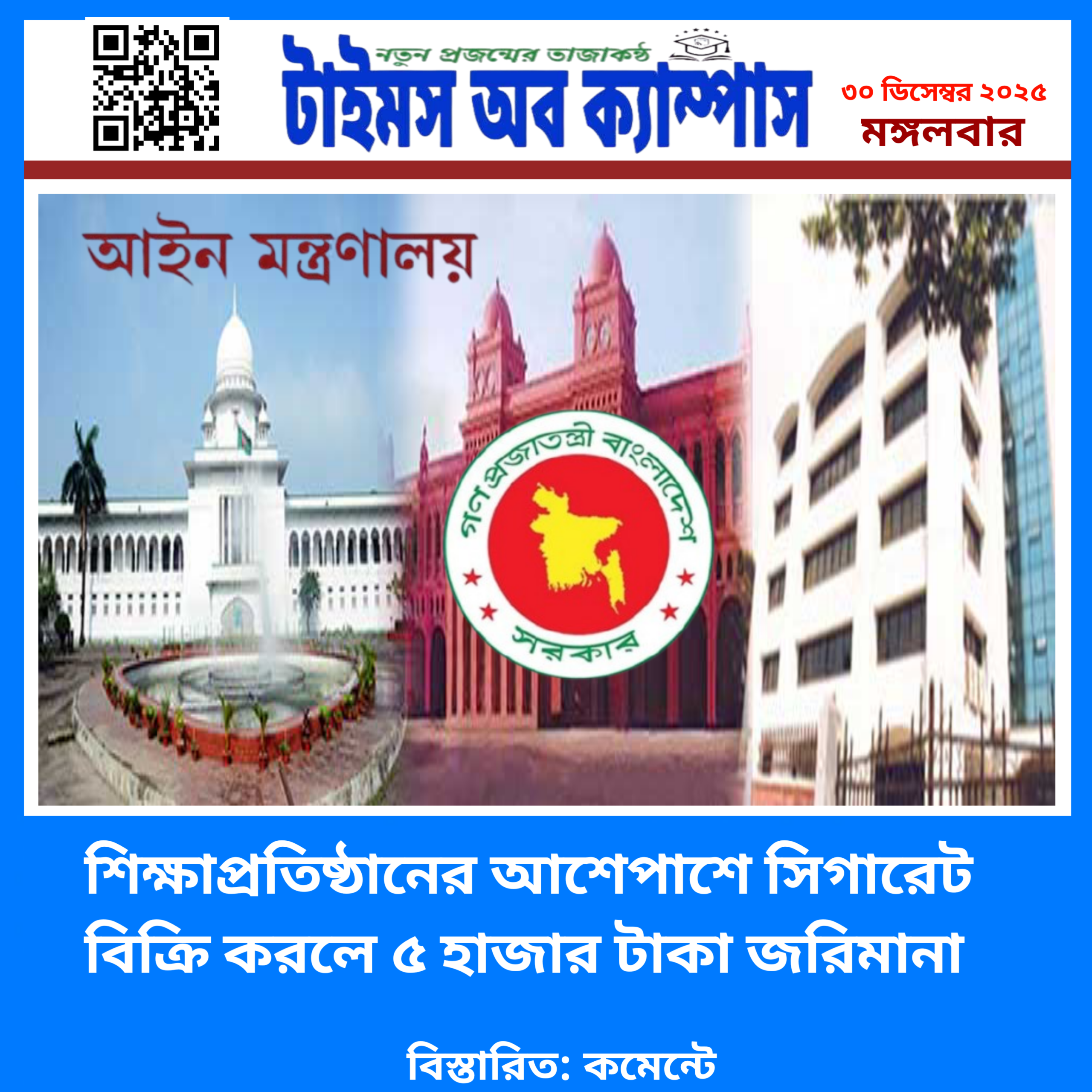 ✪টাইমস অব ক্যাম্পাস ডেস্ক রিপোর্ট: শিক্ষাপ্রতিষ্ঠান, হাসপাতাল, ক্লিনিক, খেলাধুলার স্থান ও শিশুপার্কের আশপাশে তামাক বিক্রির ক্ষেত্রে সর্বোচ্চ পাঁচ হাজার টাকা