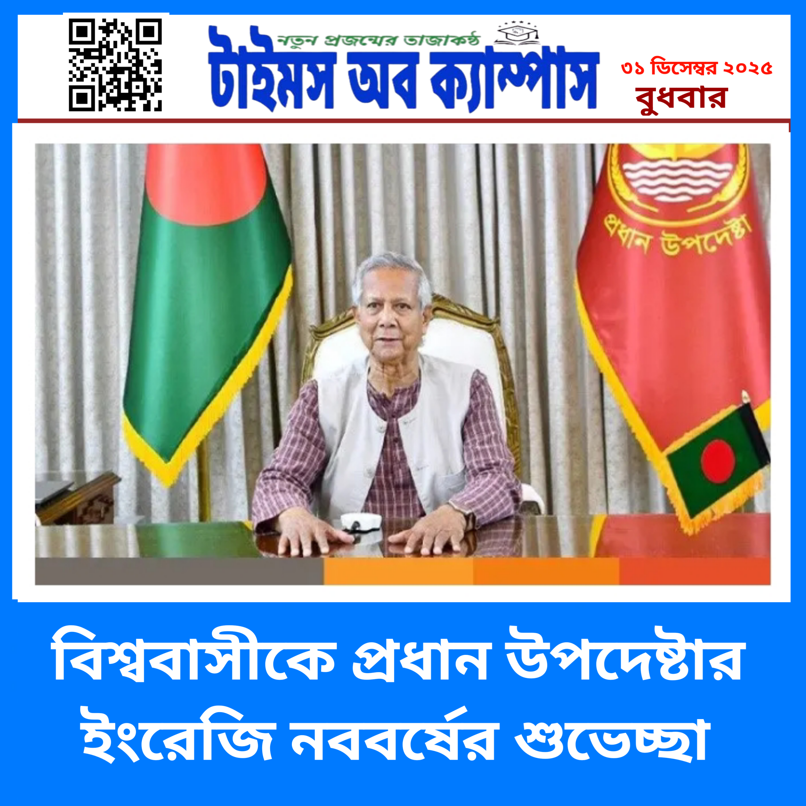 ✪টাইমস অব ক্যাম্পাস ডেস্ক রিপোর্ট:ইংরেজি নববর্ষ ২০২৬ উপলক্ষে দেশে ও বিদেশে বসবাসরত বাংলাদেশিসহ বিশ্ববাসীকে শুভেচ্ছা জানিয়েছেন প্রধান উপদেষ্টা অধ্যাপক ড.