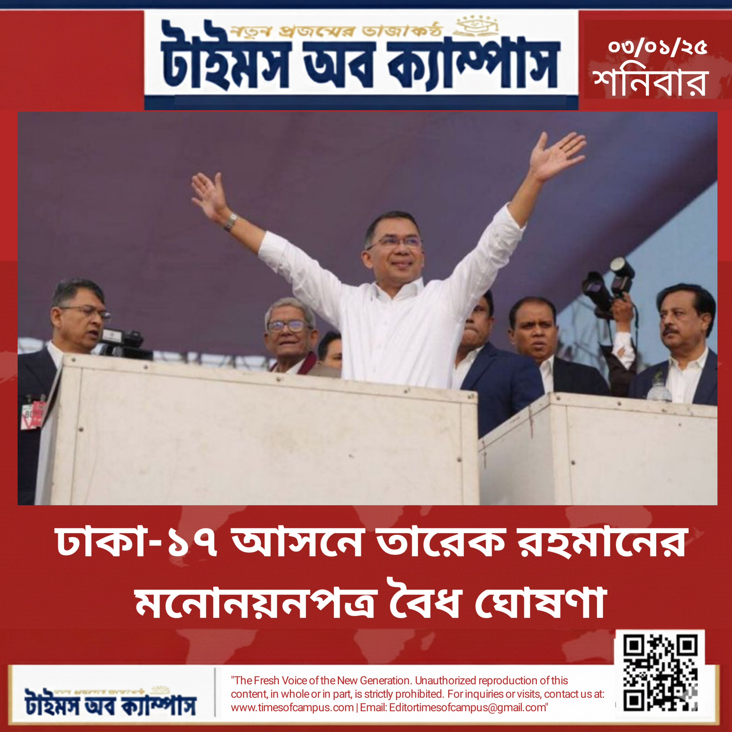✪ টাইমস অব ক্যাম্পাস ডেস্ক রিপোর্ট : ঢাকা-১৭ আসনে বিএনপির ভারপ্রাপ্ত চেয়ারম্যান তারেক রহমানের মনোনয়নপত্র বৈধ ঘোষণা করা হয়েছে। এ