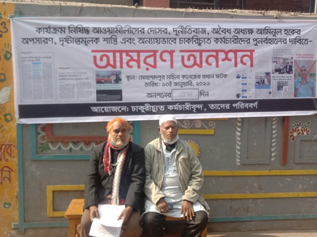 অধ্যক্ষ আমিনুল হকের অপসারণ-শাস্তি ও চাকুরীচ্যুত কর্মচারীদের পুনর্বহালের দাবিতে আমরণ অনশন